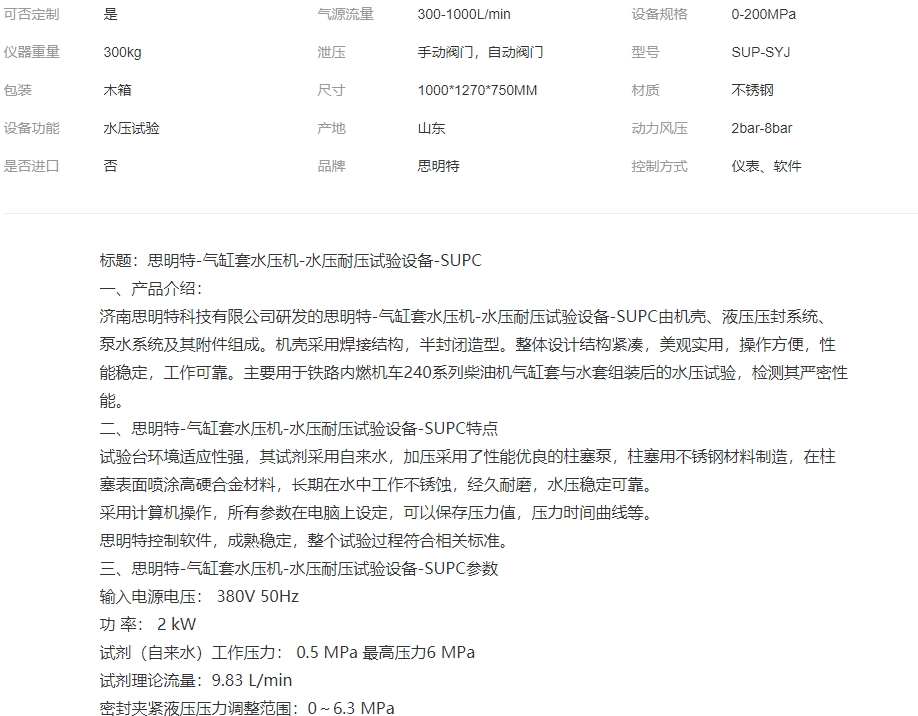 气缸套水压机水压耐压试验设备SUPC 300-1000L/min 思明特定制